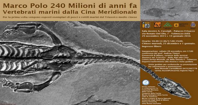La Comunità Montana della Carnia, nell’ambito delle attività di CarniaMusei e del Museo Geologico della Carnia, propone una mostra paleontologica dal titolo “Marco Polo 240 Milioni di anni fa. Vertebrati marini dalla Cina Meridionale”.