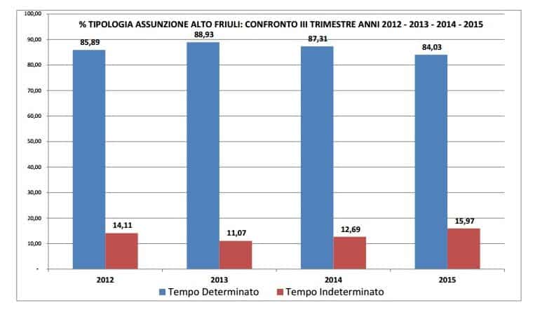 Continua a dare segnali di ulteriore miglioramento il rapporto assunzioni/cessazioni in Alto Friuli dopo il terzo trimestre di rilevazioni. Il saldo alla fine del settembre scorso è positivo per 688 unità (era a quota 546 nello stesso periodo del 2014, a 119 nel 2013), frutto di un recupero di 119 contratti negli ultimi tre mesi, di cui gran parte costituito da donne.