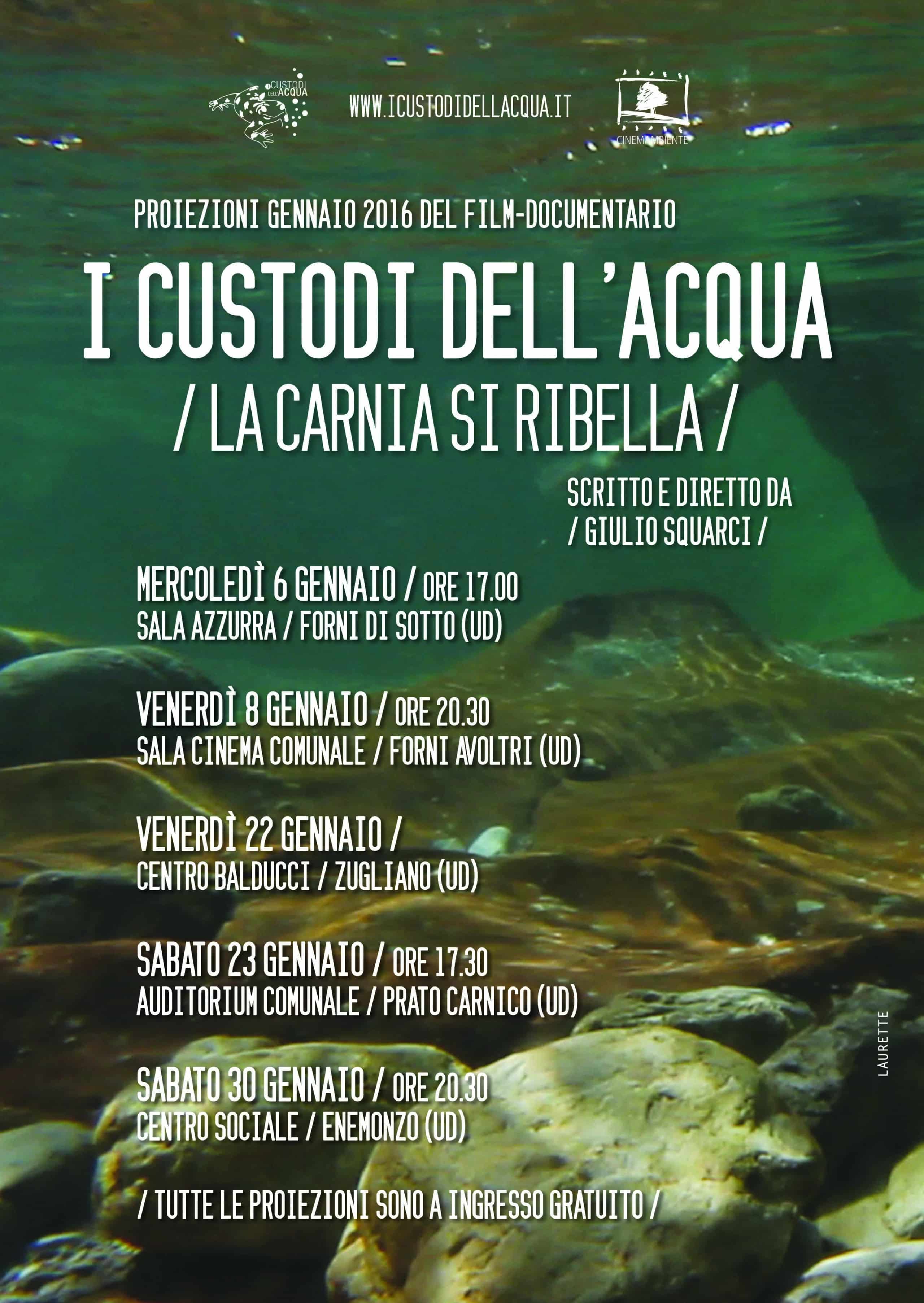 Dopo una grande partecipazione delle persone nelle proiezioni del mese di dicembre, continuano anche a gennaio le serate con i “Custodi dell’Acqua-La Carnia si Ribella”, il documentario del regista Giulio Squarci.