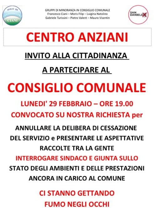 Nuovo appuntamento lunedì 29 febbraio, alle ore 19, in sala consiliare alla Guarneriana, con il Consiglio comunale di San Daniele del Friuli che ancora una volta avrà al centro del dibattito cittadino la questione del Centro residenziale per anziani di Via Cadorna.
