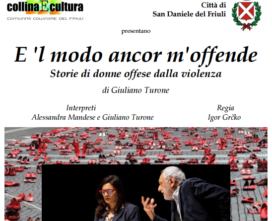 “E ‘l modo ancor m’offende – Storie di donne offese dalla violenza” è il titolo dello spettacolo di Giuliano Turone che verrà messo in scena domani, Mercoledì 2 marzo 2016 alle ore 20.35 all’Auditorium Alla Fratta di San Daniele del Friuli, con ingresso libero fino ad esaurimento posti. Gli interpreti sono lo stesso Turone e Alessandra Mandese, la regia è di Igor Grčko.