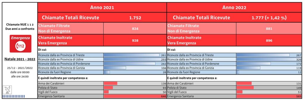 Domenica 25 dicembre al Nue 112 sono arrivate in tutto 1.777 chiamate. Si è registrato pertanto un aumento rispetto all’anno precedente (+1,42%, vedi tabella sotto).