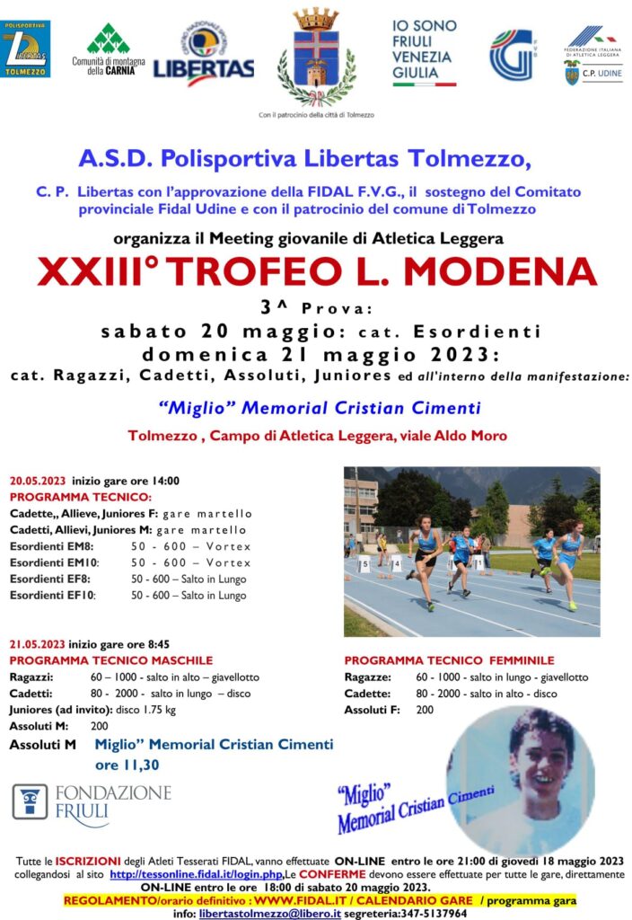 La Libertas Tolmezzo dedicherà inoltre un momento di raccoglimento in memoria di Martina Socciarelli, la giovanissima ragazza di Verzegnis scomparsa recentemente in un incidente stradale. La giovane faceva parte della società di atletica carnica ed aveva partecipato anche al Trofeo Modena. «Ricordando Martina e Cristian, il pensiero andrà anche agli altri nostri giovanissimi atleti che nel corso degli anni hanno perso la vita», dicono dalla Libertas.