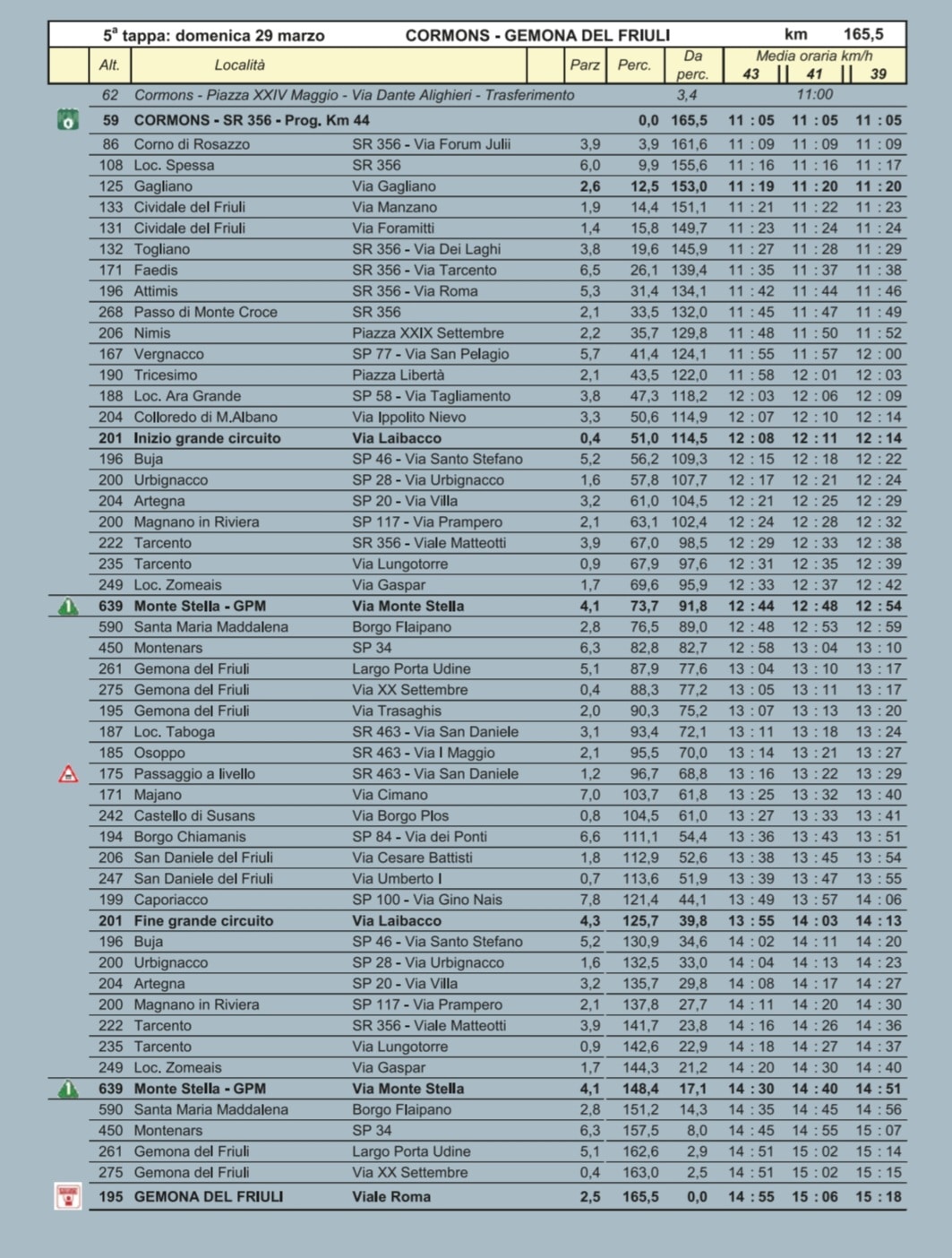 Per consentire lo svolgimento della manifestazione in sicurezza e l’allestimento delle strutture d’arrivo, il Comune di Gemona ha disposto modifiche alla viabilità cittadina per l’intera giornata di domenica. Dalle 6 alle 19 ci sarà il divieto di sosta con rimozione coatta in numerose vie del centro e lungo il percorso di gara, tra cui via IV Novembre, largo Porta Udine, via Bini, piazza del Municipio, via XX Settembre e le zone limitrofe a via Trasaghis e via della Cartiera. Particolare attenzione va prestata alla zona della stazione e a viale Roma, dove oltre al divieto di sosta, sarà interdetto totalmente il transito veicolare per permettere le operazioni legate al traguardo e alle premiazioni. Secondo la cronotabella ufficiale, il primo passaggio a Gemona è previsto intorno alle 13, mentre la conclusione della gara è stimata, a seconda della media oraria, tra le 14:55 e le 15:18.
