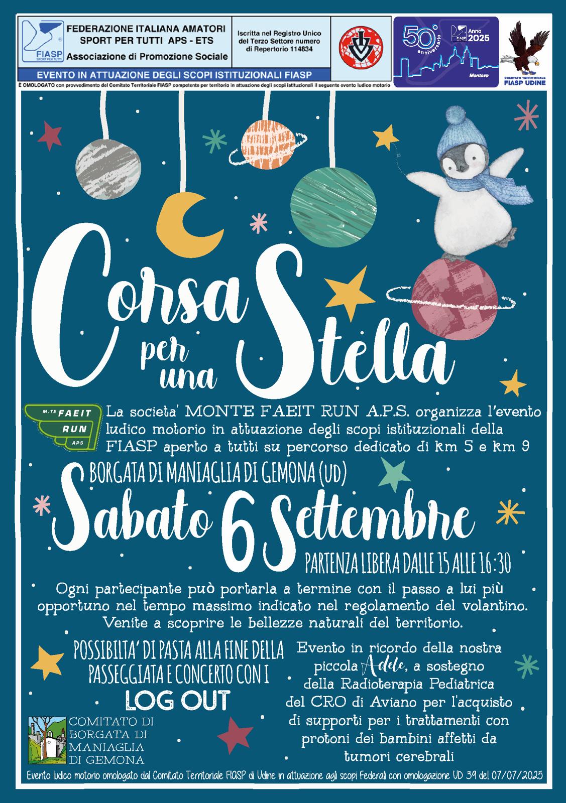 Si chiama “Corsa per una stella” la manifestazione non competitiva di beneficenza in programma sabato 6 settembre alle 15 a Maniaglia di Gemona in ricordo di Adele Copetti, mancata nell’agosto del 2022 per un cancro al tronco encefalico a soli 7 anni. L’evento è voluto dai genitori di Adele, con il sostegno del Comitato Borc di Maniae, il patrocinio della Monte Faet Run e della Fiasp.
