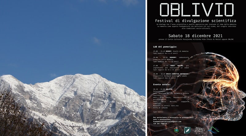 Il Comune di Resia e l’Ecomuseo Val Resia organizzano, grazie al contributo del Consorzio BIM Tagliamento, un Festival di divulgazione scientifica dal titolo “Oblivio”, con il coinvolgimento di Gianluca Da Lio, Elia Zanin, Marco Buttolo e Virna Di Lenardo.