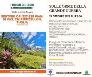 Sabato 29 ottobre ai Piani di Vas, in comune di Rigolato, con ritrovo alle ore 9.30, si svolgerà sui sentieri Cai 227 e 228 fino a Malga Tuglia l’escursione denominata “Sulle orme della Grande Guerra”.