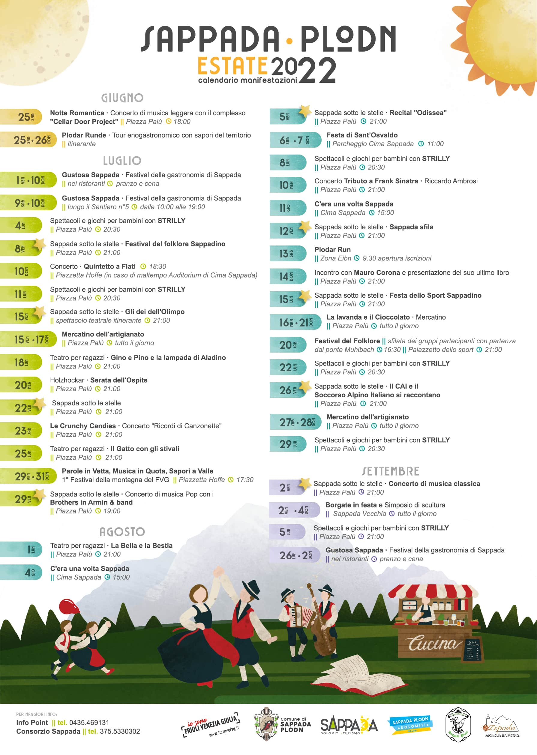 Il prossimo appuntamento in calendario è per i primi 10 giorni di luglio: si tratta di “Gustosa Sappada”, il festival della gastronomia montana, che ritornerà l’ultima settimana di settembre, fino al 2 ottobre, per concludere la kermesse estiva di manifestazioni.