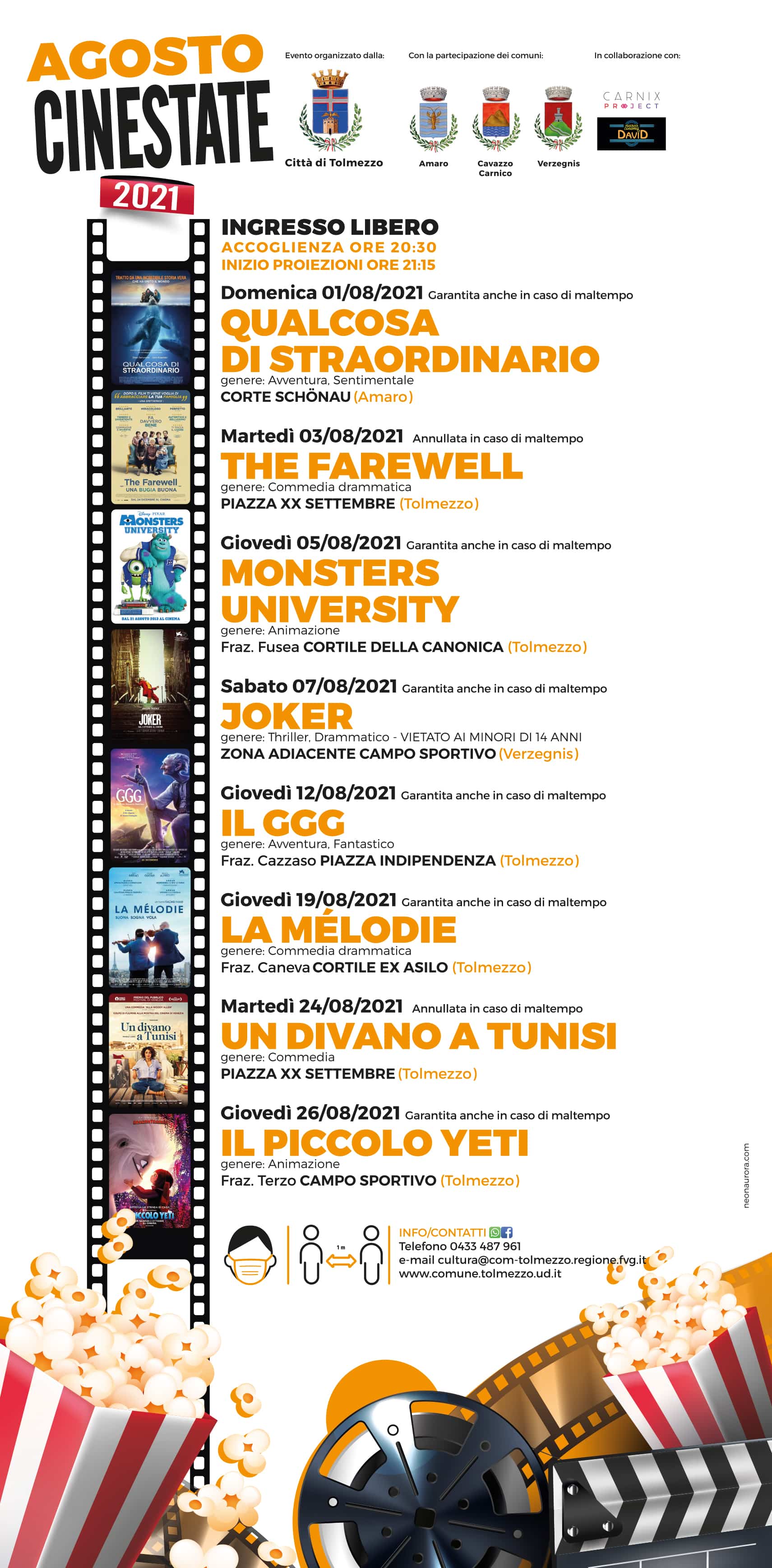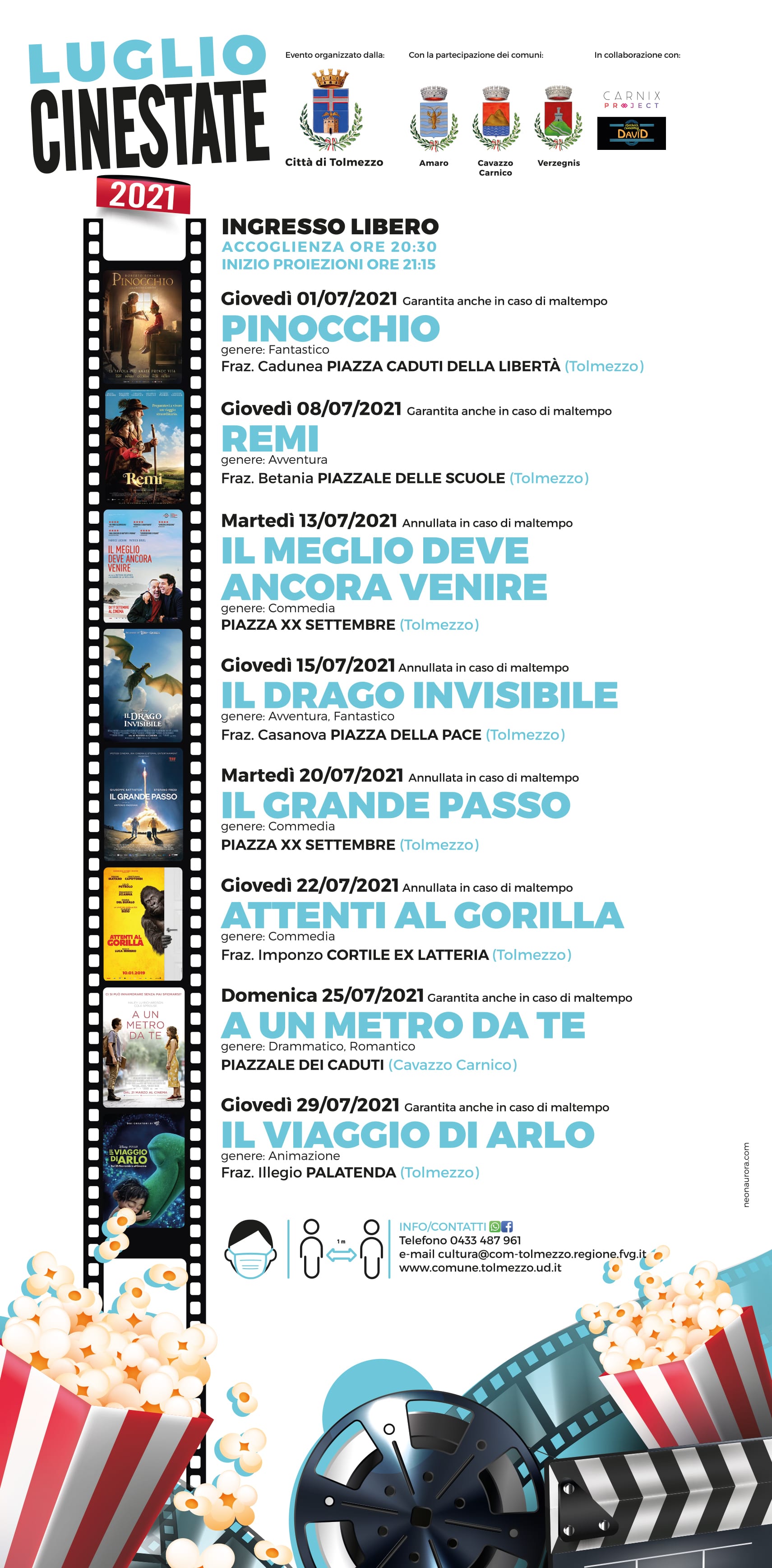 In caso di maltempo le proiezioni in piazza XX Settembre a Tolmezzo saranno annullate così come quelle a Casanova e a Imponzo; garantite invece anche in caso di condizioni meteo sfavorevoli tutte le altre date sia nelle frazioni di Tolmezzo sia nei comuni di Amaro, Cavazzo Carnico e Verzegnis.