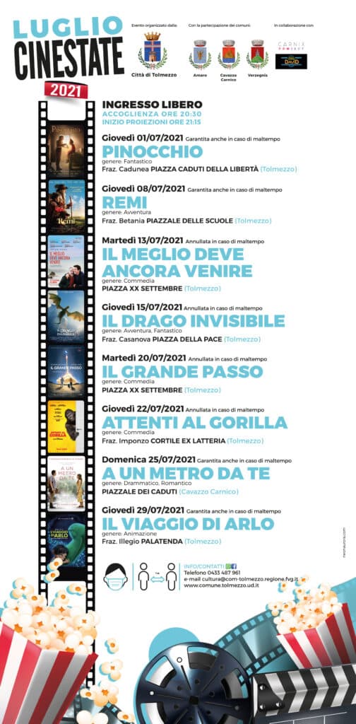 “Riportiamo la magia del cinema all’aperto su tutto il territorio cittadino, con quattro proiezioni speciali nella piazza del capoluogo e toccando tutte le frazioni, creando così un coinvolgimento pensato davvero per tutta la città e ampliato ormai dallo scorso anno anche alla bella sinergia con gli altri comuni della Conca”. commenta l’assessore alla cultura e agli eventi di Tolmezzo, Marco Craighero. “Un percorso variegato ed eterogeneo che abbiamo realizzato guardando in primis ai più giovani e alle famiglie, ma non solo, unendo anche proiezioni d’essai e di diversi generi, e che caratterizzerà l’estate tolmezzina in attesa della riapertura autunnale del Cinema David. Un grande ringraziamento fin da subito ai tanti ragazzi e volontari che si son messi a disposizione per realizzare questi appuntamenti”.