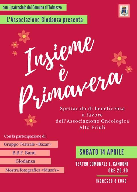 Sabato 14 aprile alle ore 20.30 il Teatro Candoni di Tolmezzo ospiterà “Insieme è Primavera”, spettacolo proposto dall’Associazione Giodanza a favore dell’Associazione Oncologica Alto Friuli.