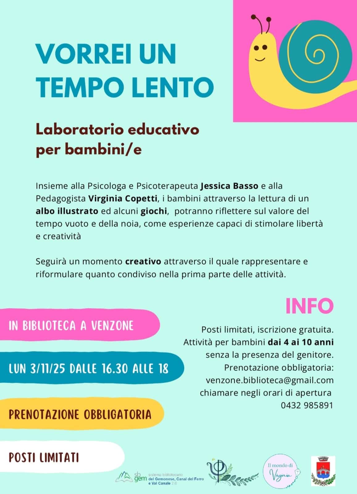 Si chiama “Vorrei un tempo lento” il laboratorio educativo per bambini e bambine in programma lunedì 3 novembre in biblioteca a Venzone.