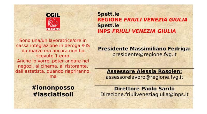 “Ad oggi circa 15mila lavoratrici e lavoratori nella nostra Regione attendono il pagamento della cassa integrazione in deroga. La cassa integrazione in deroga, provvedimento la cui autorizzazione è in capo alla Regione Friuli Venezia Giulia, non poteva prevedere, per normativa, l’anticipo da parte dell’impresa. Il Fis invece (Fondo di Integrazione Salariale), liquidato da parte dell’Inps senza necessità di autorizzazione preventiva, poteva esser anticipato dall’impresa oppure pagato direttamente dall’Istituto previdenziale. Si tratta di migliaia di lavoratrici, soprattutto, e lavoratori del comparto turistico, commercio al dettaglio, dipendenti di estetisti, parrucchieri, studi professionali, bar, addetti al pulimento, alberghi…lavoratrici e lavoratori la cui attività è sospesa da marzo e che ad oggi ancora non hanno ricevuto l’indennità. Si tratta di lavoratrici e lavoratori le cui imprese hanno deciso di non anticipare l’ammortizzatore (nel caso di Fis) anche se a parer nostro avrebbero potuto, in molti casi, prevederlo; donne e uomini in condizione di solitudine e abbandonate da tutto il sistema politico, non formalmente ma nei fatti. Sappiamo benissimo che fanno poca notizia, trattandosi di aziende e imprese con spesso due o tre lavoratori, e certamente per questo non affascinano l’opinione pubblica come invece accade per un grande agglomerato industriale, ma contribuiscono in maniera decisiva alla ricchezza del territorio, ergendosi spesso a veri e propri luoghi di aggregazione e socialità. Anche loro vorrebbero poter tornare a fare shopping nei negozi, a cenare al ristorante o magari andare dall’estetista, quando in totale sicurezza riapriranno, ma non potranno farlo perché non ne avranno le disponibilità economiche. Noi, a queste donne ed a questi uomini, cercheremo di dar voce e volto perché no, noi non li dimentichiamo. Per questo da domani martedì 12 maggio inizierà una campagna social di condivisione di una cartolina virtuale da inviare, attraverso i social ma soprattutto via mail, al Presidente della Regione Fvg, all’Assessore al Lavoro della Regione Fvg ed al Direttore regionale dell’Inps”.
