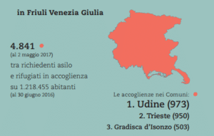 Nell’Alto Friuli 20 Centri di Accoglienza straordinaria per 141 posti con 10 operatori; nel Medio e Basso Friuli 15 strutture, 150 posti e sette operatori; nel cividalese il Progetto Sprar con sette strutture, 40 posti e sette operatori; a Udine il Progetto Aura con 12 strutture, 121 posti e sette