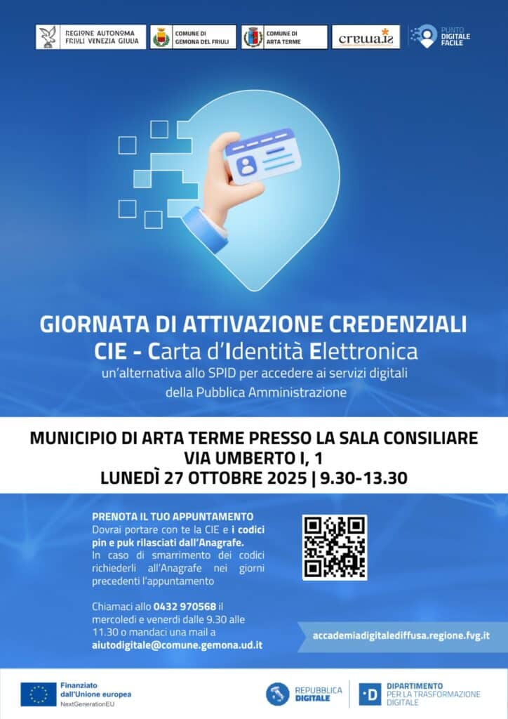 Lunedì 27 ottobre, alle 9.30 alla 13.30, al Municipio di Arta Terme appuntamento con la Giornata di attivazione della Carta d’Identità Elettronica (CIE).