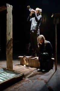 Aida Talliente dà voce a quegli uomini e quelle donne. Racconta le loro storie ammantata da una scenografia dove tre soglie di legno diventano molti luoghi: tombe, case, nicchie, oppure porte da attraversare da un dentro a un fuori e che continuamente evocano situazioni temporali diverse tra presente e passato. “Miniere” è un percorso affettivo tra le parole, i volti, i suoni e i ricordi di un intero paese che ha fatto di tutto per non morire. Una storia di lotta, che alla fine non ha avuto eroi ma solo uomini e donne che hanno tentato un volo.