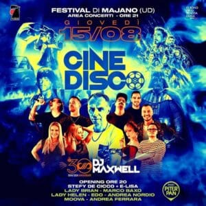 La 64° edizione del Festival si concluderà giovedì 15 agosto con l’ultimo spettacolo in programma sul palco dell’area concerti, dal titolo Cinedisco. Da un’idea di Dj Maxwell, in occasione dei trent’anni di attività, Cinedisco è il primo Cinemusic Party che unisce il meglio del cinema e della musica elettronica in un unico grande spettacolo. Attraverso la sinergia tra immagini mozzafiato, sonorità avvolgenti e interazioni coinvolgenti, questo Show promette di trasportare il pubblico in un’esperienza immersiva e multisensoriale, stimolandone i sensi in modo originale e sorprendente. L’appuntamento è alle ore 20.00, ingresso libero.