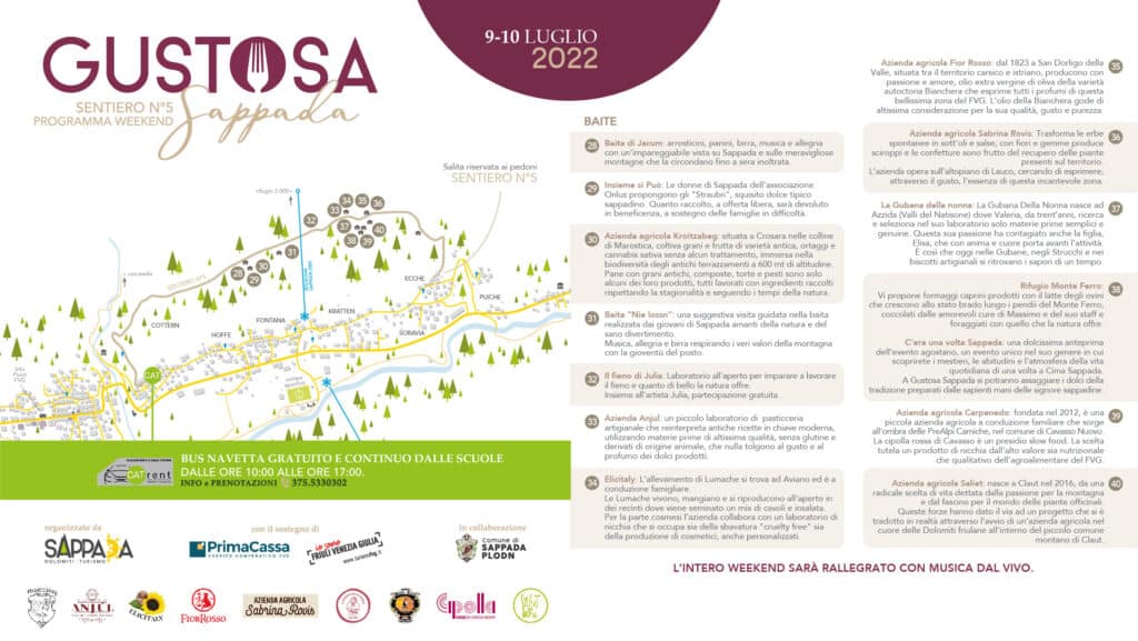 Gastronomia, musica, tradizioni e panorama mozzafiato: questi gli ingredienti previsti sbaato 9 e domenica 10 luglio alla manifestazione “Gustosa Sappada”. La formula per il fine settimana è quella delle feste in baita e le degustazioni nei ristoranti. Alla proposta delle 27 attività di Sappada e Forni Avoltri, tra ristoranti, rifugi, b&b, pasticcerie botteghe alimentari che aderiscono al festival, si aggiunge infatti, per il week end, la passeggiata lungo il sentiero n° 5 di Sappada. Sulla strada silvo-pastorale che accoglie numerose e bellissime baite tipiche montane, si svolgerà una mostra mercato di produttori dell’agro alimentare della regione; si farà festa con musica, birra, barbecue e animazione in una delle baite e si potrà visitare quella realizzata dai giovani sappadini che, per l’occasione, faranno da ciceroni per raccontare la loro montagna. Sarà inoltre possibile assistere alla rappresentazione di scene della Sappada che fu, con donne vestite con i costumi di una volta che offriranno i dolci dell’antica tradizione gastronomica locale. Si potrà anche partecipare ad un laboratorio creativo e gratuito con il fieno. Un servizio navetta gratuito consente agli ospiti di raggiungere agevolmente il sentiero n° 5 dalle scuole di Sappada; chi vorrà invece raggiungere la festa a piedi potrà accedere dal sentiero che parte dalla Borgata Ecche.