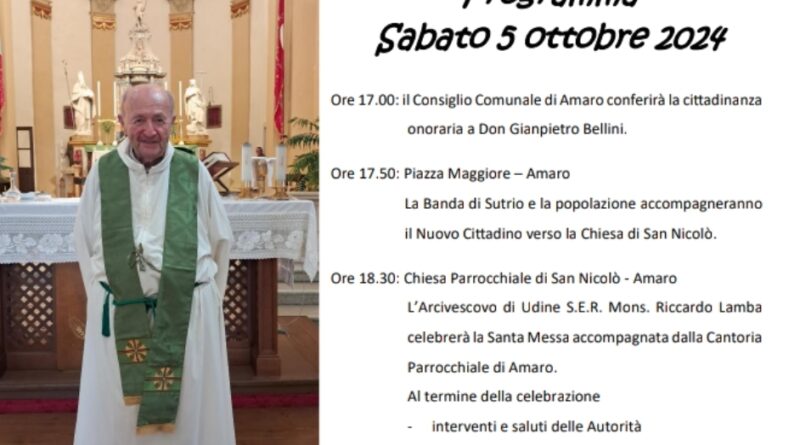 Il Consiglio Comunale di Amaro conferirà la cittadinanza onoraria a don Gianpietro Bellini, in occasione del cinquantesimo anniversario della sua attività pastorale nella comunità. La cerimonia si terrà nella sala consiliare del Municipio sabato 5 ottobre alle 17.
