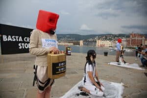 Basta crimini climatici. Stop al fossile”, così enuncia il banner che ha fatto da sfondo a un’azione dimostrativa, dove è stato versato del finto petrolio su due persone a terra. A versarlo, da due taniche d’oro, due figure che rappresentavano la SIOT e la Regione FVG.