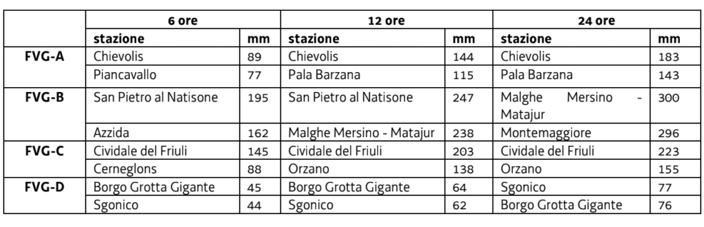 In tabella le precipitazioni massime registrate in 6, 12 ore e da inizio evento (aggiornamento delle ore 13 di venerdì 5 giugno).