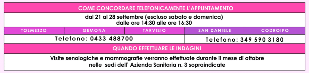 Oltre a questo gesto simbolico, le Associazioni A.N.D.O.S. di Tolmezzo e Codroipo offriranno a tutte le donne del territorio che lo desiderano – in collaborazione con la stessa Azienda per l’Assistenza Sanitaria n.3 “Alto Friuli – Collinare – Medio Friuli” – l’opportunità di effettuare visite senologiche, gratuite e prenotabili telefonicamente dal 21 al 28 settembre 2018.