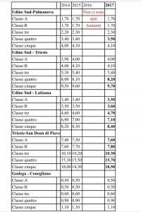 Aumenti molto contenuti (fra i dieci e i trenta centesimi di euro) che in alcune tratte, per effetto del meccanismo di arrotondamento, non scattano. Confermate le agevolazioni ai pendolari.