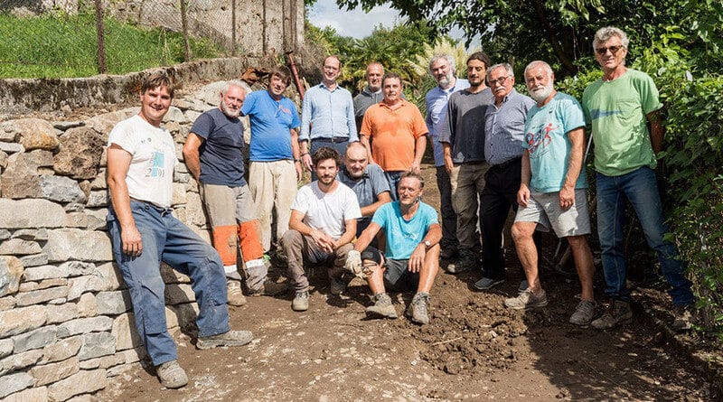 Una parte del muro in pietra a secco lungo l’antico tracciato che da Aplia Inferiore discende il versante è stata ripristinata grazie al lavoro e alla dedizione di una dozzina di artigiani e praticanti: Tommaso, Primo, Mario e Mario, Elisa, Gianpiero, Giovanni Battista, Carlo, Giorgio, Primo, Rico, Geremia e Angela (non ci sono gerarchie tra i partecipanti ai cantieri) si sono impegnati a fondo nell’arco di due settimane, mettendosi alla prova (le difficoltà non sono mancate, causa la pioggia e un cordolo in cemento preesistente che ha richiesto soluzioni rapide) per apprendere le particolari tecniche costruttive relative a questa tipologia di manufatti.