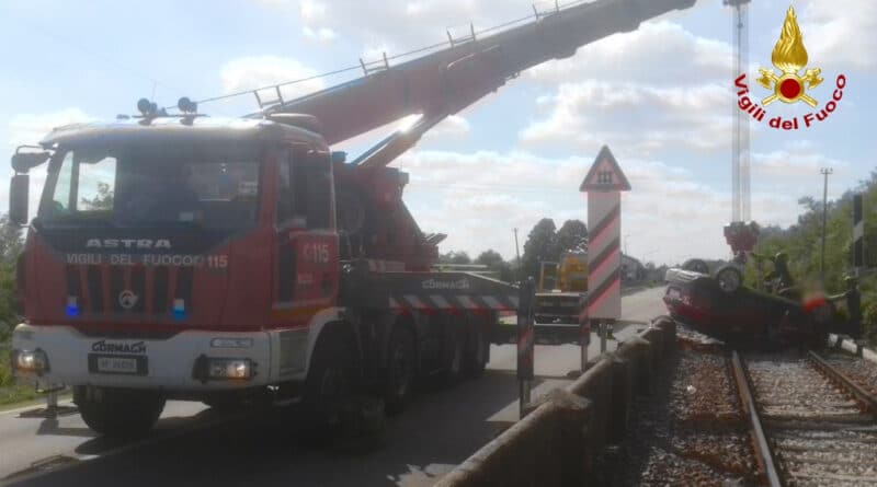 Auto finisce ruote all’aria sui binari, il treno si ferma in tempo