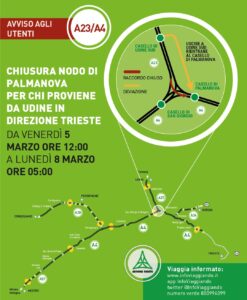 Per questo weekend Autovie Venete ha quindi pianificato la chiusura del ramo Udine – Trieste del Nodo dalle ore 12,00 di venerdì 5 marzo alle ore 05,00 di lunedì 8. Pertanto chi arriva dalla A23 Tarvisio/Udine ed è diretto a Trieste potrà uscire a Udine Sud, seguire le frecce gialle sulla viabilità ordinaria e riprendere il percorso autostradale sulla A4 al casello di Palmanova oppure seguire la direttrice di marcia per Venezia, uscire a San Giorgio di Nogaro, rientrare allo stesso casello e reimmettersi in A4 in direzione Trieste.