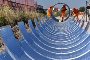 In parallelo alla costruzione del ponte (in realtà le strutture sono due, una per carreggiata) anche i lavori lungo l’intera tratta – 26 chilometri complessivamente – autostradale dove è previsto l’allargamento a tre corsie proseguono rapidamente: dalla costruzione del rilevato alla deviazione dei canali necessaria per consentire l’intervento (in questo caso l’acqua viene convogliata all’interno di speciali condotte che ne spostano temporaneamente il corso), fino allo spostamento delle interferenze (gas, elettricità, cavi per il trasporto dati).