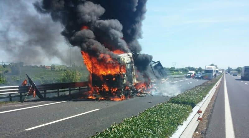 Autostrada A4 chiusa fra Latisana e Portogruaro in direzione Venezia in seguito a un incidente accaduto verso le 10 e 30 di questa mattina. Impossibile, per ora stabilire la dinamica dell’incidente che ha visto coinvolti un mezzo pesante e un secondo veicolo che è andato a incastrarsi sotto il primo. Un violento incendio ha distrutto completamente i due mezzi. Personale di Autovie Venete, 118 e Vigili del fuoco sul posto per i soccorsi, in arrivo anche un mezzo speciale per la rimozione dei veicoli incastrati che occupano la corsia di marcia.