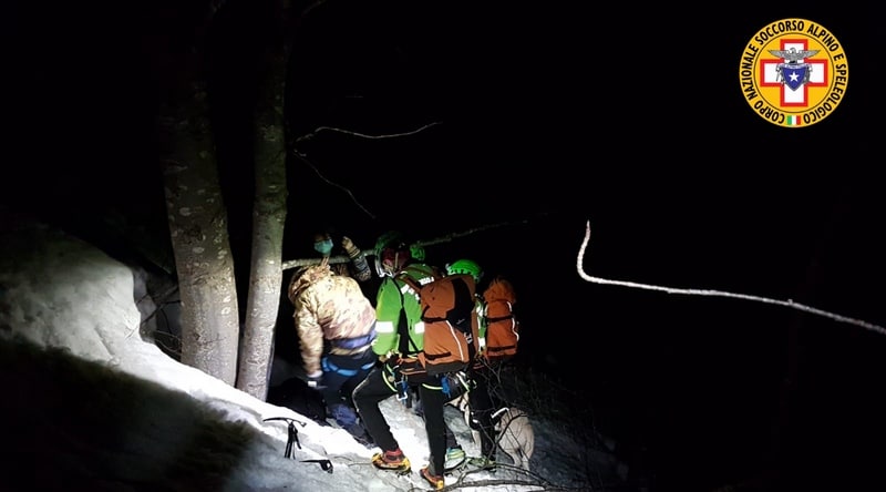 Li hanno sentiti alle 21.00, arrivando lungo il sentiero sopra di loro e avvistando le luci delle loro torce frontali. Si sono calati nella faggeta con l’aiuto delle corde, hanno fatto calzare loro ramponi e imbracatura e li hanno legati per assicurarne la risalita.