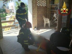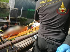 I vigili del fuoco hanno improntato uno “scivolo” con le scale in dotazione per calare in sicurezza a terra l’infortunato, mediante barella toboga e corde SAF.