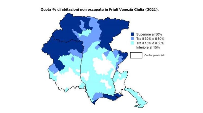 Anche le “seconde case” entrano nel computo degli immobili non occupati, che infatti si trovano soprattutto nelle località di vacanza, dove in gran parte coincidono con le case ad uso turistico. Ma una quota importante di abitazioni vuote, tra il 15% e il 30%, si trova in molte zone del Friuli Venezia Giulia.