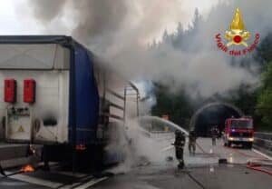 Secondo una prima ipotesi l’incendio, sviluppatosi sul rimorchio, potrebbe essere nato da un surriscaldamento dei freni: l’autista, comunque, è uscito indenne dalla situazione staccando in tempo la matrice. L’autoarticolato trasportava birra e altri materiali, di cui nessuno pericoloso.