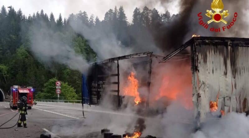 Traffico intasato sulla A23 in direzione sud per un autoarticolato in fiamme. L’incidente è avvenuto al chilometro 115 dell’autostrada tra gli svincoli confine di Stato e Tarvisio nord, prima della Galleria monumento I, nei pressi di Tarvisio.