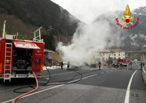 Poco prima delle 10.30 di oggi le squadre dei Vigili del fuoco di Gemona e Tarvisio sono intervenute sulla SS 13 nella frazione Vidali, in comune di Dogna, per l’incendio di un mezzo pesante.