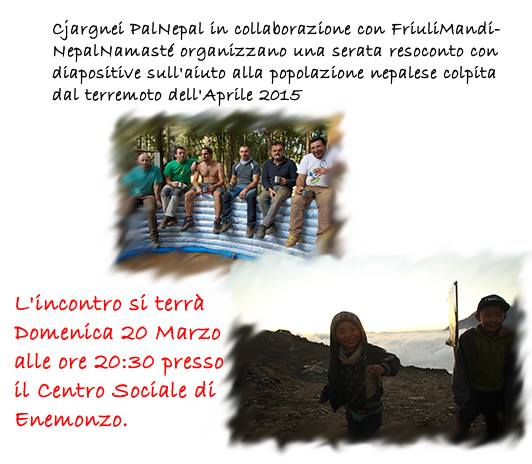 Serata NepalDomenica 20 marzo alle ore 20.30, presso il Centro Sociale di Enemonzo, si svolgerà una serata di condivisione e beneficienza a favore della popolazione del Nepal duramente colpita dal sisma nell’aprile dello scorso anno.
