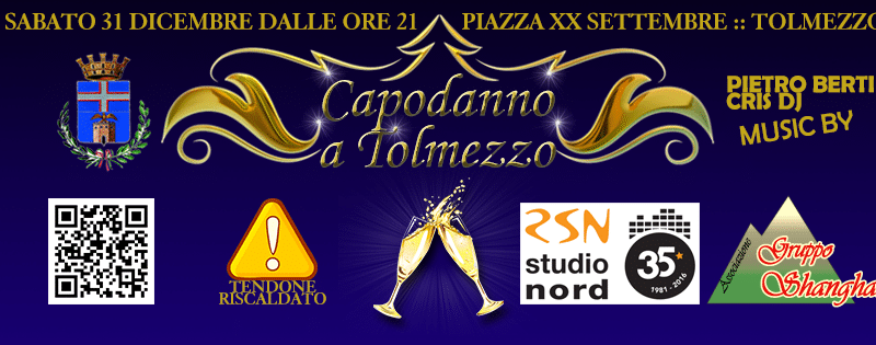 L’Associazione Gruppo Borgo Shanghai con il Patrocinio e la collaborazione del Comune di Tolmezzo, presenta il CAPODANNO A TOLMEZZO. Aspetteremo e festeggeremo l’arrivo del 2017 AL CALDO sotto il TENDONE RISCALDATO questa sera in Piazza XX settembre a partire dalle ore 21:00, INGRESSO GRATUITO
