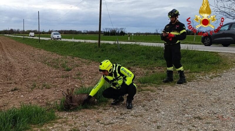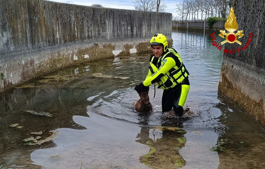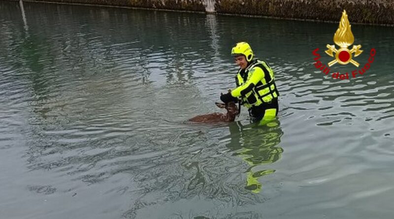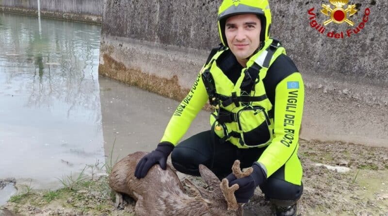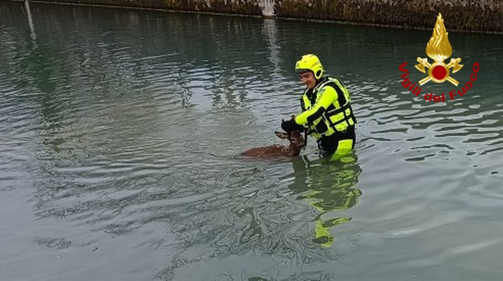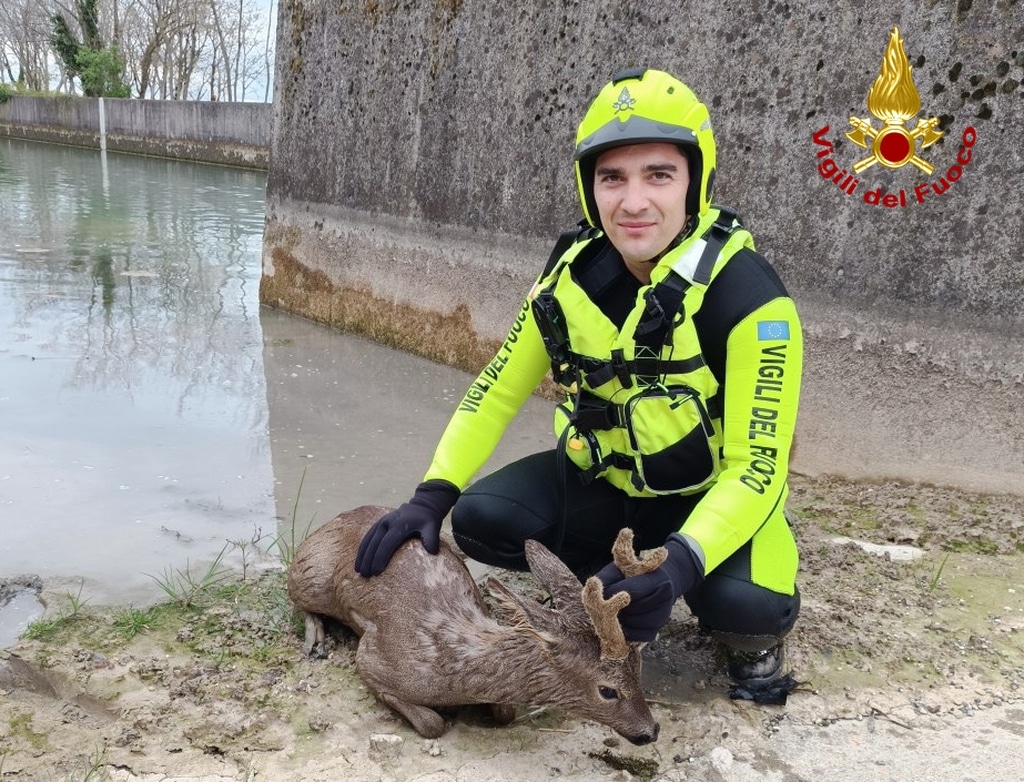 Capriolo cade in un canale e non riesce a risalire, lo salvano i Vigili del Fuoco