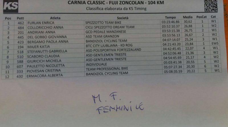 Nella Medio Fondo, con percorso ridotta a 104 km senza quindi lo Zoncolan, ha vinto Andrea Chiminello sempre della Spessotto Bike Team, in due ore 56 minuti, alle sue spalle Alessandro Bianchin e Andrea Mazzucco. Enrica Furlan si è imposta nella gara femminile, anch’essa della Spezzotto Bike Team, seguita da Anna Colloricchio e Anna Andriani. Si è chiusa così a Tolmezzo una settimana di grande sport, turismo e relazioni commerciali con il Giappone. Ed ora si inizia già a pensare al maggio 2018 quando il Giro d’Italia, salvo contrordini dell’ultima ora, vedrà una tappa partire proprio da Tolmezzo.