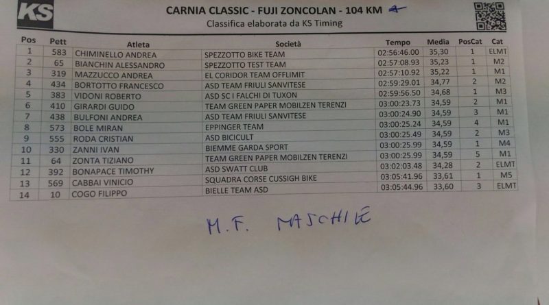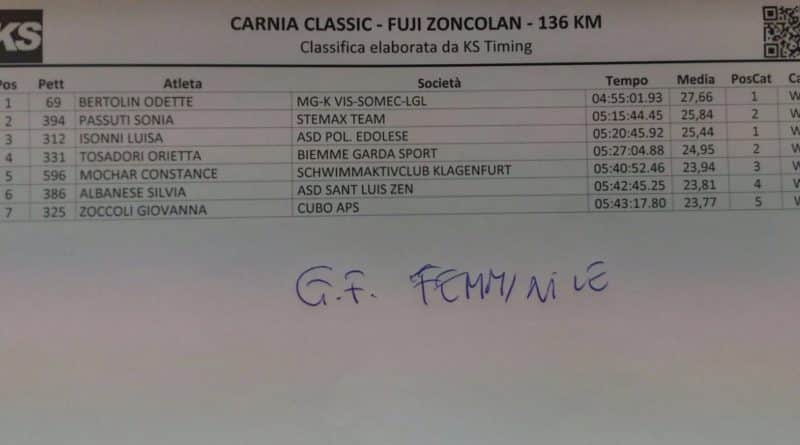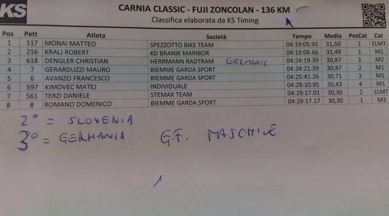 E’ stato il corridore della Spessotto Bike Team Matteo Monai a tagliare per primo il traguardo dell’edizione 2017 della Carnia Classic, la gran fondo di ciclismo con partenza ed arrivo a Tolmezzo, e con l’ardua scalata dello Zoncolan quale pezzo forte di un tracciato lungo 134 km. Il suo tempo è stato di 4 ore 19 minuti 5 secondi. Dietro di lui si sono piazzati lo sloveno Robert Kralj e il tedesco Cristian Dangler. Per la gara femminile la prima piazza del podio è stata conquistata da Odette Bertolin della Mg k vis, seguita da Sonia Passuti e Luisa Isonni.