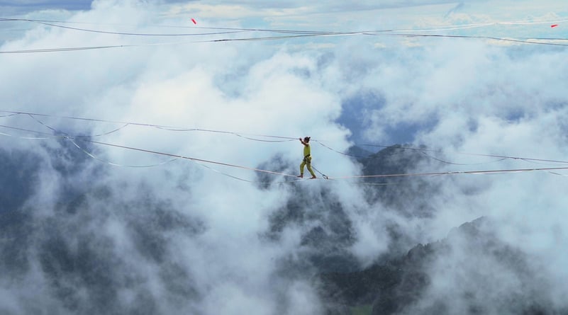 Leggi tuttoViene documentata l’impresa di Carlo Cozzio, ovvero camminare bendato andata e ritorno su una slackline sospesa nel vuoto