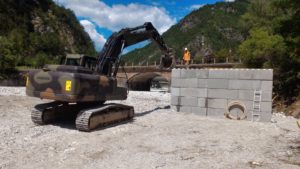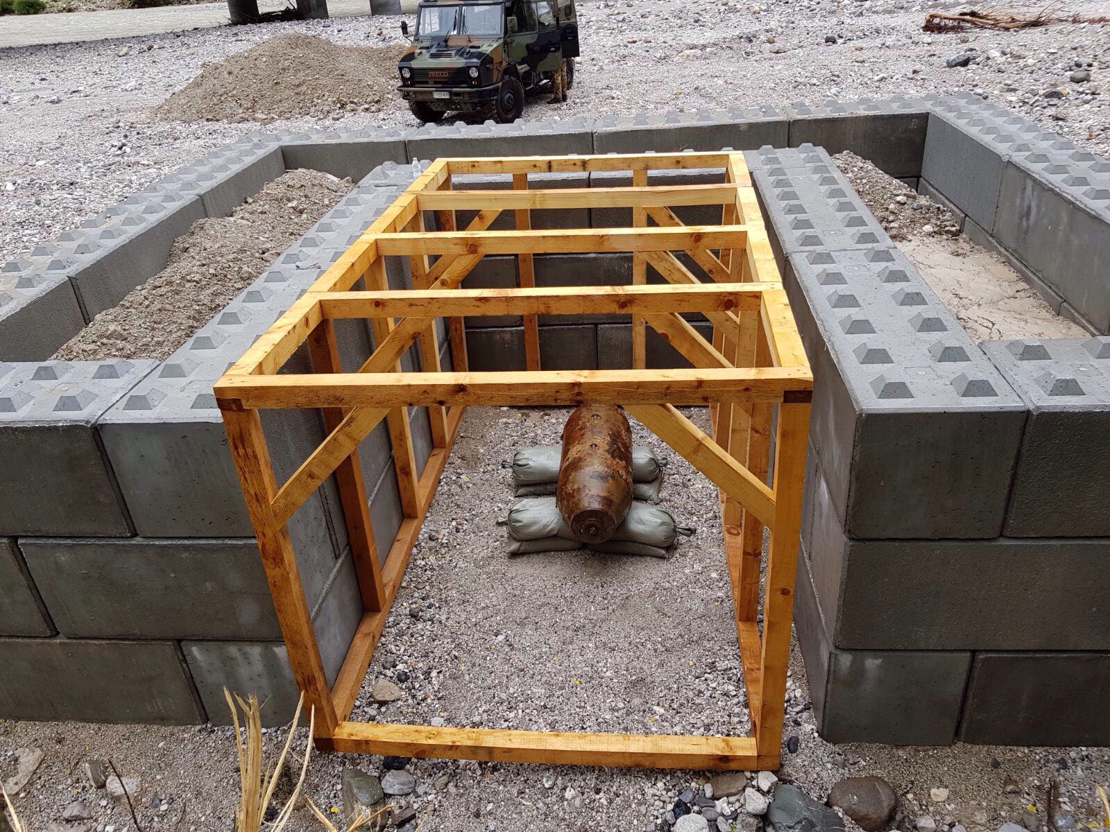 L’attività è stata pianificata in tre fasi. La prima fase si è già conclusa: è stata costruita attorno alla bomba sul luogo di rinvenimento, una struttura temporanea di contenimento, per limitare al massimo i disagi alla collettività, con l’utilizzo di moduli prefabbricati in calcestruzzo vibrato con sistema Eurolego riempiti di sabbia (nelle foto) per confinare e ridurre lo spazio esposto al rischio generato dall’eventuale detonazione accidentale del residuato.