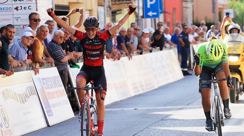 Dalle ruote grasse del fuoristrada alla prima a braccia alzate in una competizione su strada: a Villa Musone di Loreto splendida vittoria di Asia Zontone (Isolmant Premac Vittoria) al Giro delle Marche in Rosa. La ciclista di Buja ha battuto in una volata a due la compagna di fuga Gemma Sernissi dell’Aromitalia Basso Bikes Vaiano.