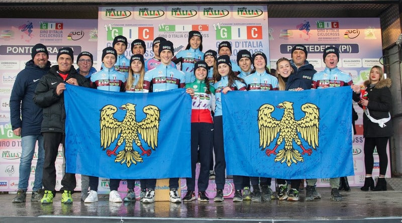 CAMPIONATO ITALIANO SOCIETÀ A DANIELE PONTONI – Fa festa il Friuli Venezia Giulia per il secondo anno consecutivo, e infatti sul podio finale del Giro d’Italia Ciclocross, a Pontedera, è stato un tripudio di bandiere azzurre con l’aquila dorata ad onorare lo scudetto vinto dalla DP 66 GIANT SMP, la squadra dell’iridato Daniele Pontoni e del presidente Bevilacqua. I friulani si sono laureati campioni d’Italia ciclocross a squadre, collezionando un bottino di ben 886 punti contro i “soli” 438 della Cicli Fiorin, giunta seconda. Completa il podio, a soli tre punti di distanza, il Team Bramati, inseguito a undici lunghezze dalla Selle Italia Guerciotti Elite, a cui è riuscito il sorpasso sulla Cicli Fiorin Cycling Team ASD (421 punti).