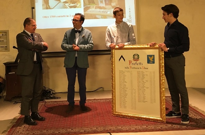 La serata si è aperta con le parole della Presidente della Regione Debora Serracchiani, la quale attraverso una lettera inviata alla Scuola, si è complimentata per i successi ottenuti nel 2016 (la realizzazione di Diari e Agende Coraniche, la MandiPen, gli accordi con Visconti e Aurora, ecc); quindi si è passati alla consegna dell’Albero Genealogico della Prefettura di Udine nelle mani del prefetto Vittorio Zappalorto, un’opera realizzata naturalmente a mano dai ragazzi dello Scriptorium, contenete l’elenco di tutti i prefetti che si sono succeduti in Friuli dall’Unità d’Italia ad oggi, e che ha trovato il plauso e l’ammirazione del massimo rappresentante dello Stato sul territorio.