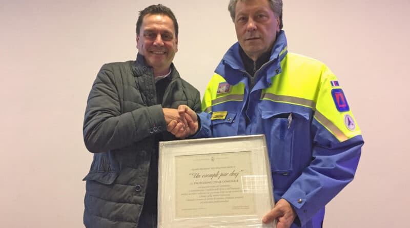 Nella foto il sindaco Luca Ovan assieme al coordinatore del gruppo della protezione civile comunale Maurizio Zampa che a nome di tutto il gruppo ha ritirato il riconoscimento.