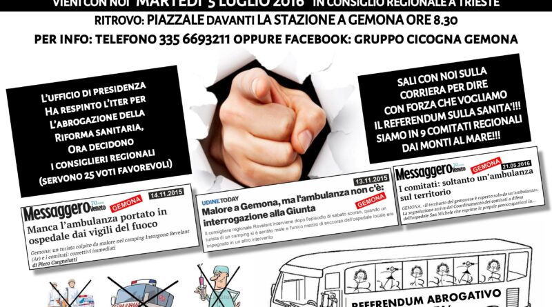 Ognuno dei 9 Comitati della Regione Friuli Venezia Giulia che si sono coalizzati per portare avanti la battaglia contro la riforma sanitaria ha organizzato localmente iniziative di partecipazione al Consiglio regionale del 5 luglio a Trieste, dove verrà discussa e votata l’ammissibilità del referendum abrogativo per il quale hanno raccolto nelle scorse settimane le firme.